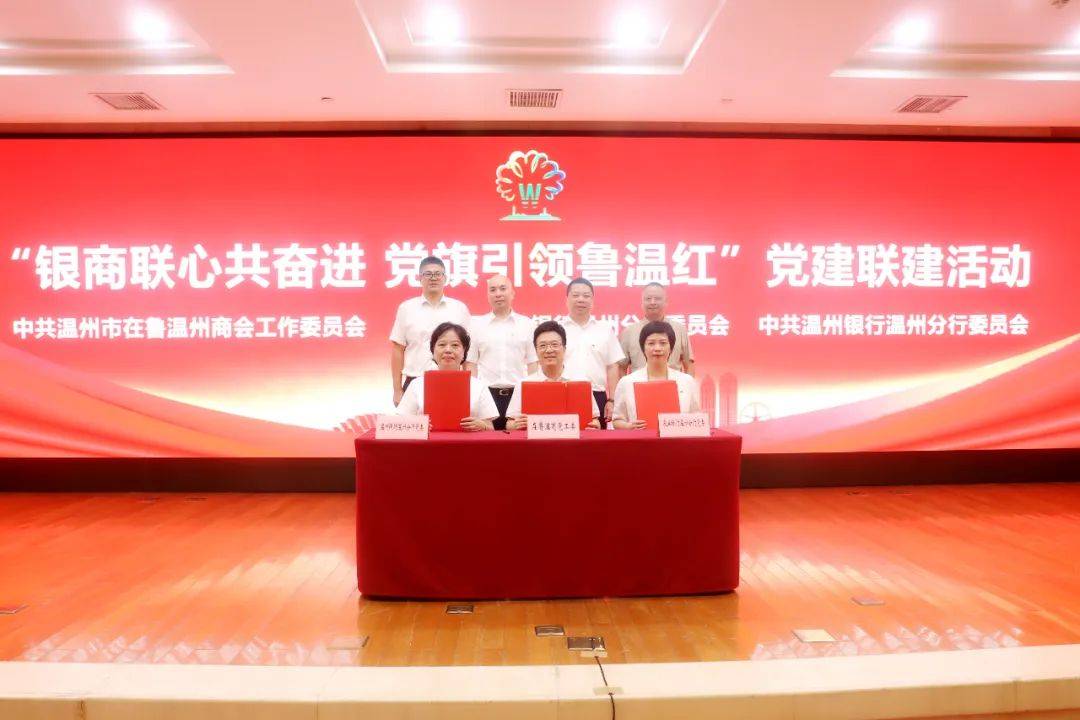 会上,在鲁温商党工委副书记、省温州商会执行会长兼秘书长陈一锋,农业银行温州市分行党委委员、副行长陈炜炜,温州银行温州分行党委委员、副行长朱晓梅分别代表中共温州市在鲁温商党工委、农业银行温州分行党委、温州银行温州分行党委签署了“银商联心共奋进 党旗引领鲁温红”党建联建协议。三方表示,将以党建为纽带,深化金融助企合作,拓宽服务领域,共同构建资源共享、优势互补的发展新格局。农业银行温州分行党委委员、副行长陈炜炜,温州银行温州分行党委书记、行长刘修恩分别发言,表示将充分发挥金融机构专业优势,为温商企业提供精准金融支持,助力民营经济高质量发展。