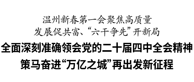 一年之计在于春。2月25日,温州市委市政府召开全市高质量发展促共富、“六干争先”开新局动员大会,坚持以习近平新时代中国特色社会主义思想为指导,深入践行“八八战略”,全面贯彻落实习近平总书记考察浙江“4+1”重要要求和省委“132”总体工作部署,按照浙江省新春第一会要求,深入实施市委“1361”思路举措,以龙马精神的昂扬姿态、策马扬鞭的奋斗激情、万马奔腾的磅礴合力,进一步动员全市上下全力做强“一圈一极一中心”,在高质量发展中促进共同富裕,昂首阔步踏上“万亿之城”再出发新征程。